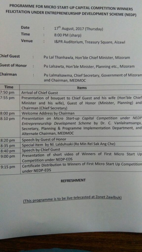 ProgrammeZawlbukShow CHANNEL: ZAWLBUK – TIME: 17th August, 2017, 8:00 PM LIVE – Micro Start-Up Capital Competition Winners Felicitation Under Entrepreneurship Development Scheme (NEDP) By Dee - August 16, 2017 0 1662 views Share on Facebook Tweet on Twitter Programme details